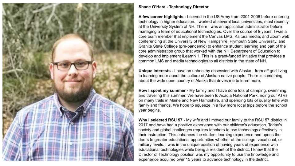 The RSU 57 School Board Meeting tomorrow evening will be moved from a 7pm start to a 6pm start. The Board Meeting will be broadcast via the same Zoom link found on the RSU 57 Calendar page. The link is also included below.